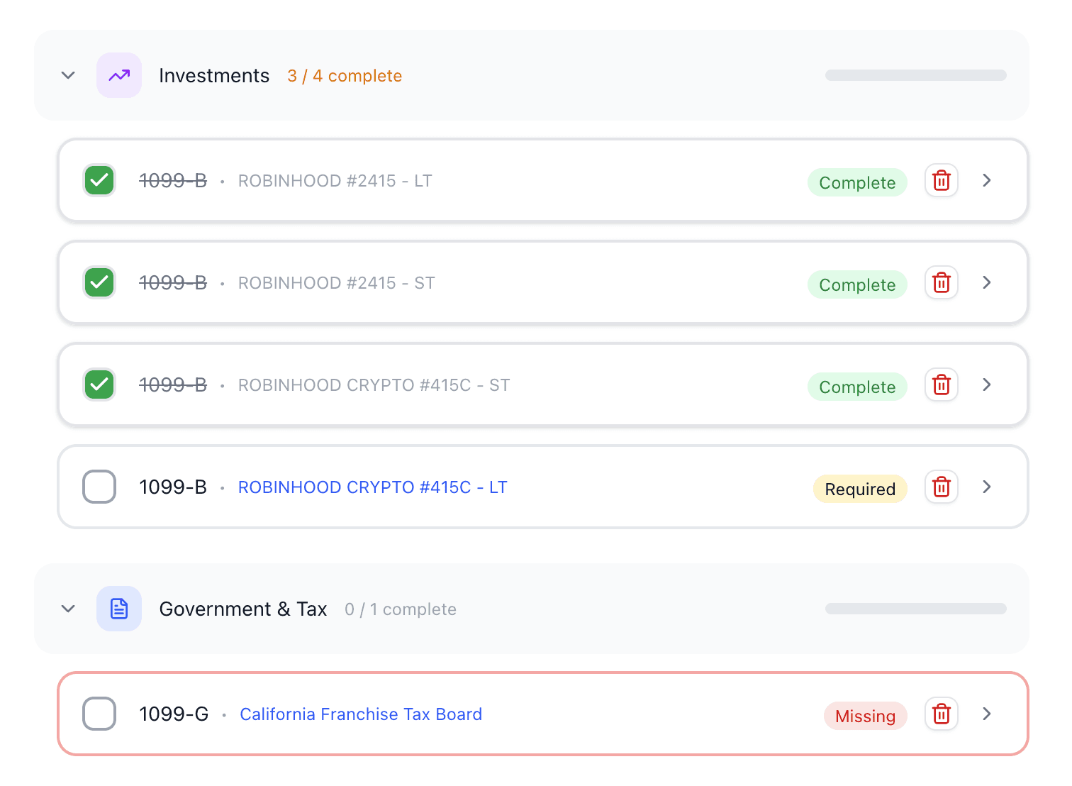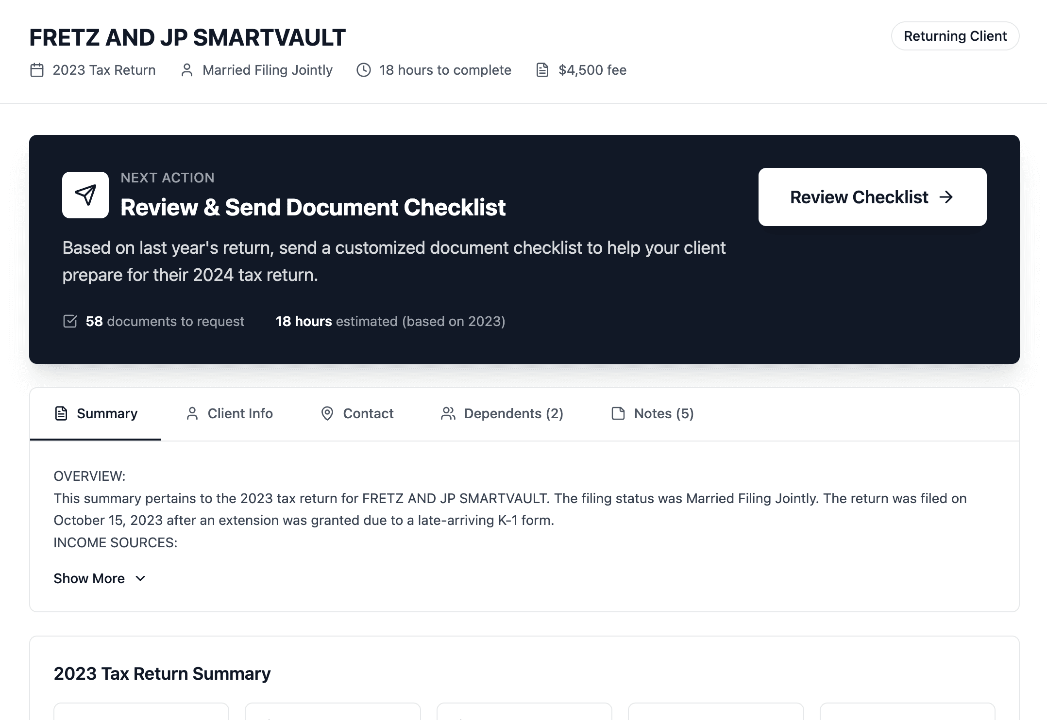 All the details from last year - income sources, deductions, properties, dependents, business specifics organized so you see what matters instantly. Scan it in 30 seconds before you send checklists. Reference it while you prep. Complete clarity on every return.