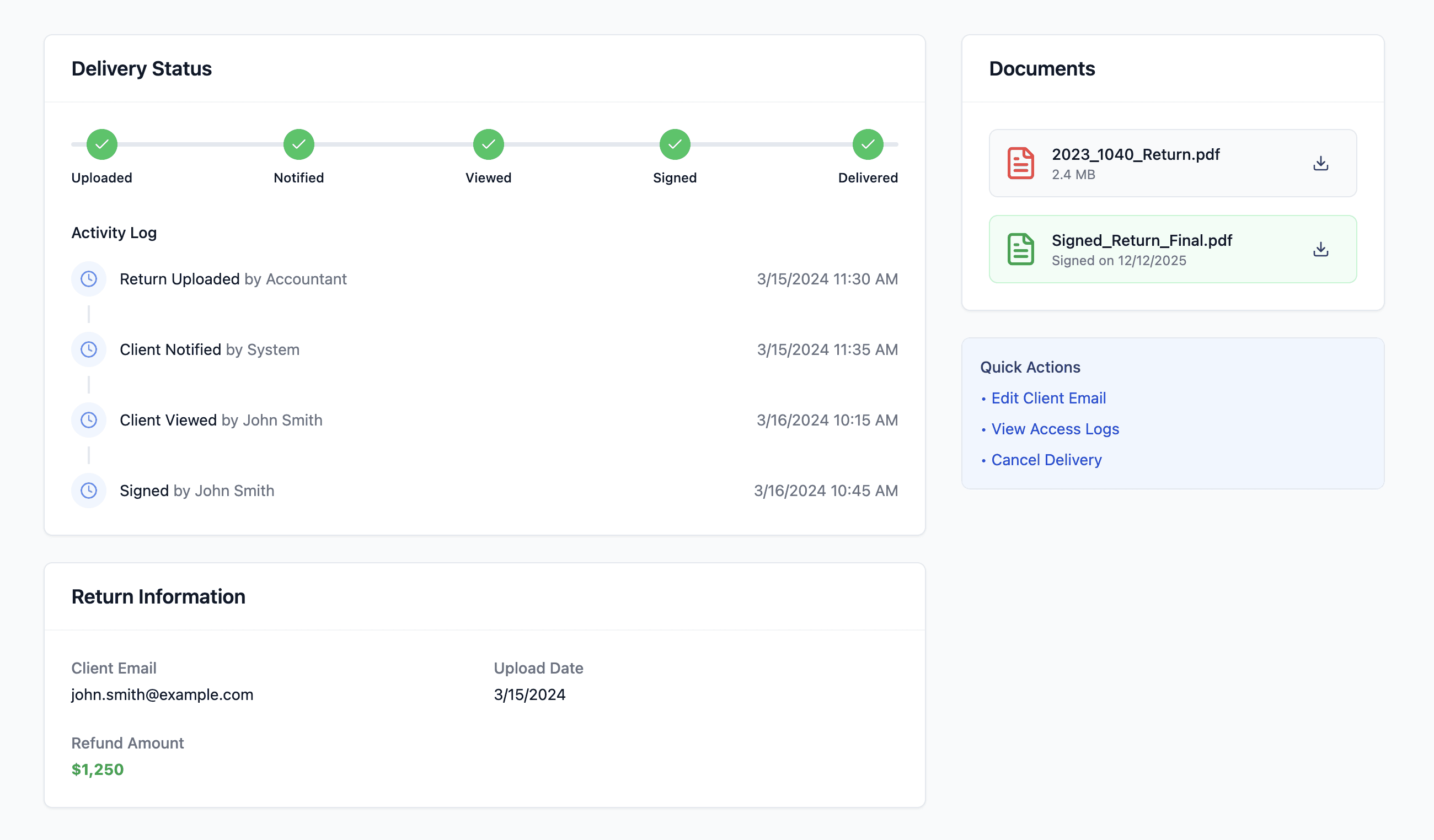 Clients receive a personalized video summary explaining their return in plain language. A beautiful, branded presentation breaks down their tax picture. Strategic recommendations for next year. All in one experience. Signature and payment in the same place. Delivery that actually makes clients understand their taxes.